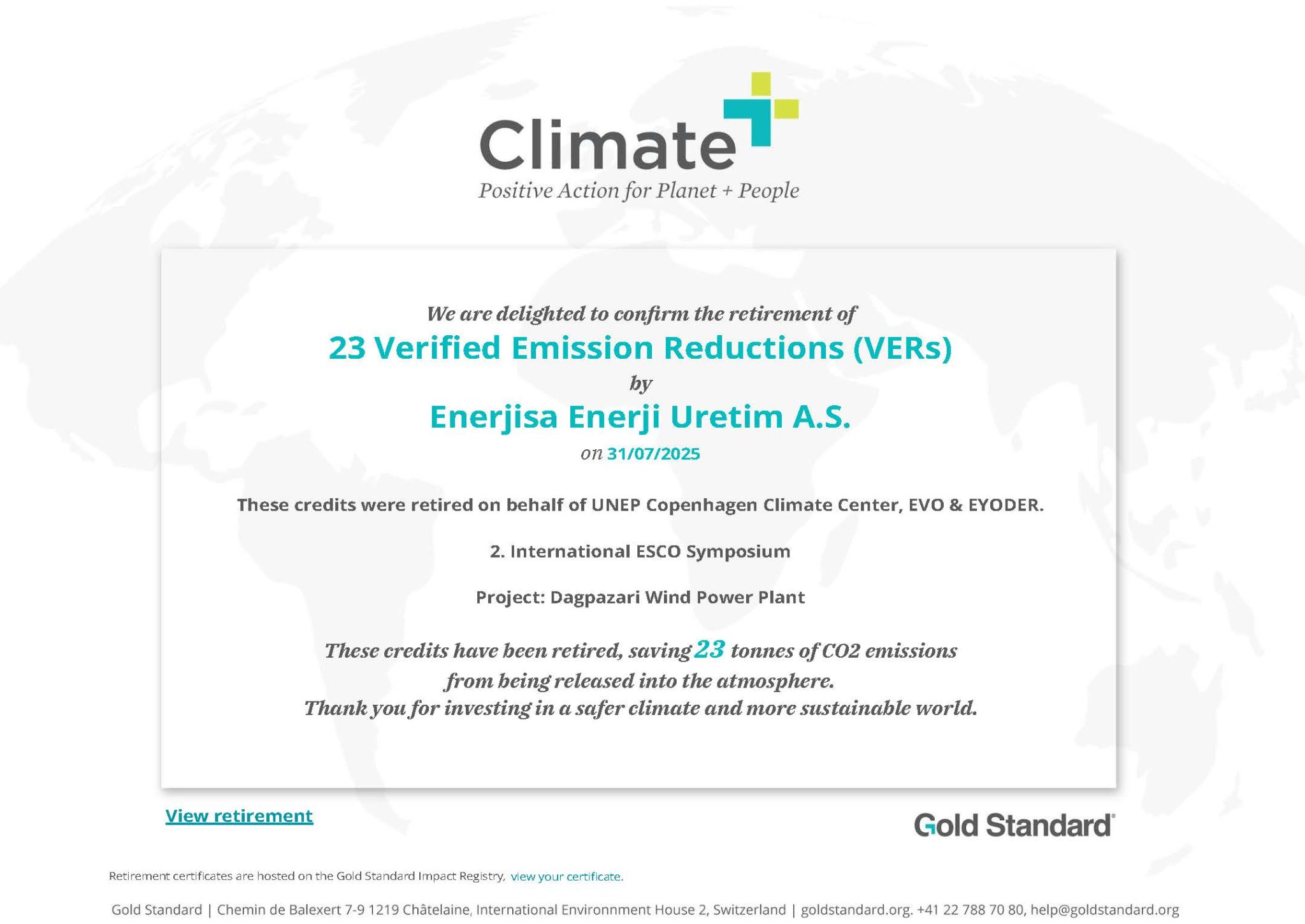 2. Uluslararası ESCO Sempozyumu kapsamında, Dağpazarı Rüzgar Enerji Santrali projesi ile 23 ton CO₂ emisyonunu dengeleyen 23 Doğrulanmış Emisyon Azaltımı (VER) başarıyla iptal edildi. Bu başarı, Enerjisa Üretim, QuickCarbon, UNEP Copenhagen Climate Centre, Efficiency Valuation Organization (EVO) ve derneğimiz arasındaki iş birliği sayesinde mümkün oldu.